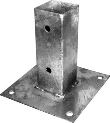 Un anclaje de apoyo de postes de hoja fija en el centro para atornillar y colocar en el hormigón.una ranura se corta en la base del poste de madera para caber sobre el soporte del poste dando un acabado limpio con sólo los pernos que muestran.